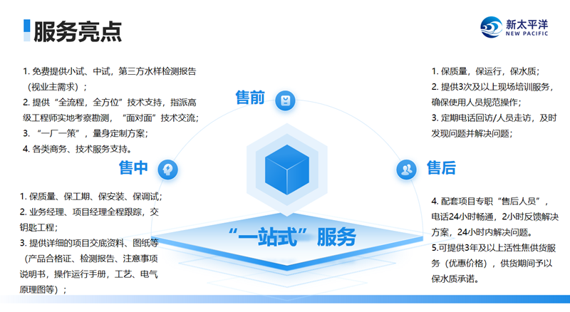 新太平洋环保拥有专业工程师团队,提供从前期小试、中试、水样检测,到项目全程跟踪及售后快速响应的定制化服务,致力于打造“交钥匙”工程,确保客户全程无忧。
